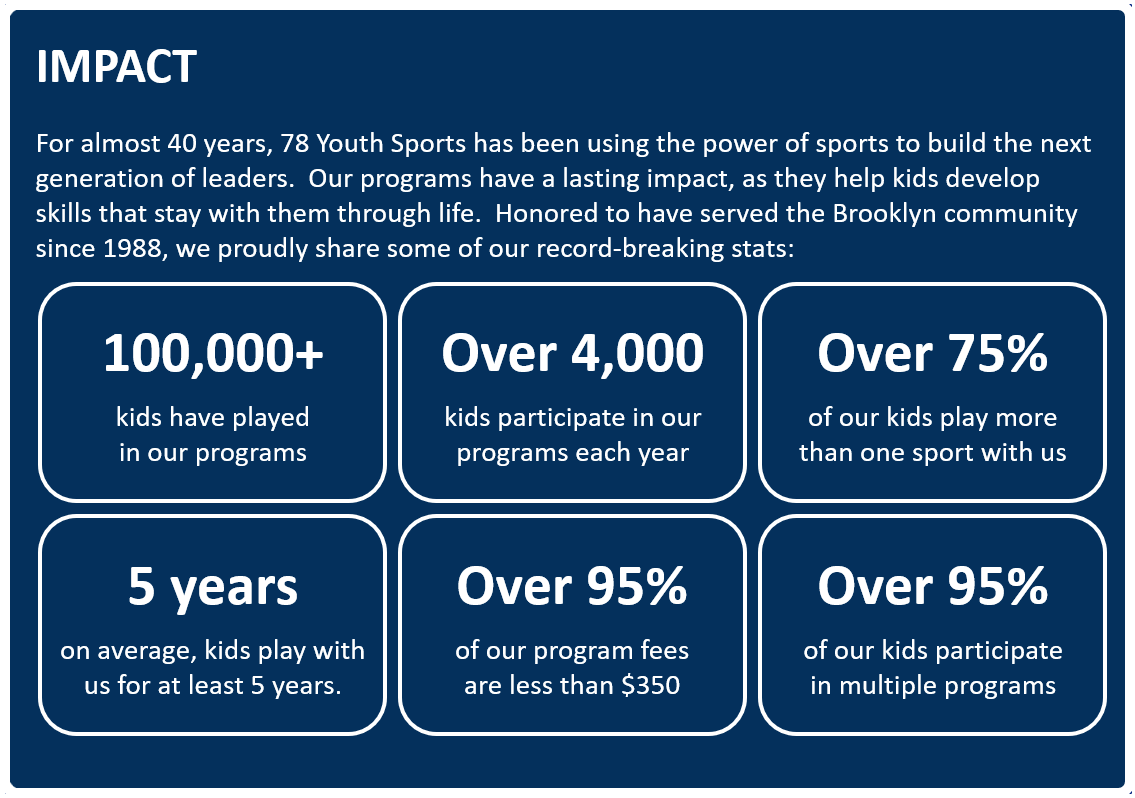In the almost four decades since our founding, we have grown to meet the demand for inclusive, affordable, and safe sports programming in Brooklyn. We offer multiple sports across all four seasons and we are especially thankful for our talented staff, dedicated Board and the thousands of passionate volunteers, without whom none of what we do would be possible.